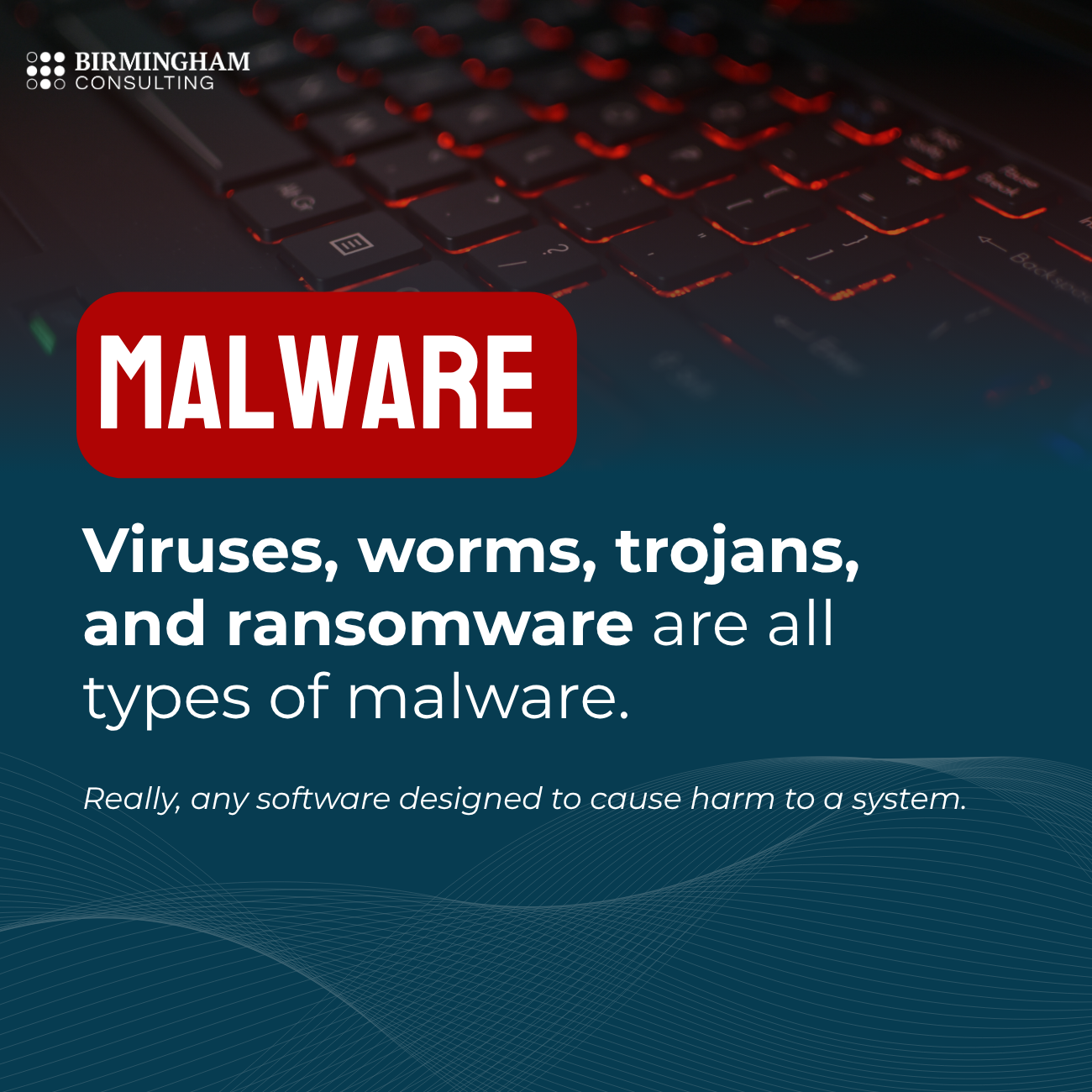 Malware is a general term for any software designed to cause harm to a system. Viruses, worms, trojans, and ransomware are all types of malware. Viruses replicate themselves and spread through systems, often causing damage or stealing information. Worms spread autonomously, while ransomware encrypts data and demands a ransom for its release.